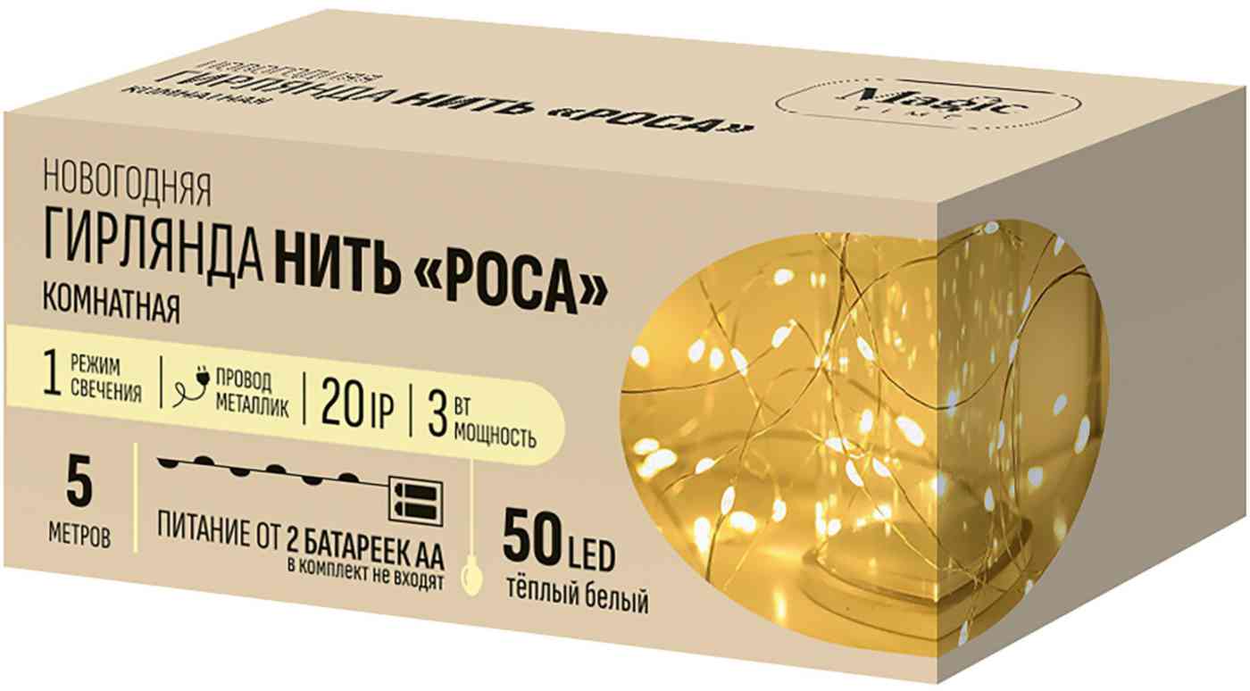 Новогодняя электрогирлянда Роса будет необычно смотреться на елке. Выглядывая из ветвей, гирлянда оживляет елку, придавая ей утонченность и изящность. Размер украшения - 500 см. Электрогирлянда имеет 50 LED-ламп теплого белого света. Работает в 1 режиме от батареек (2 элемента питания AA в комплект не входят). Гирлянды набирают все большую популярность для декора помещений. Их все чаще используют в качестве интерьерного украшения на любые праздники и даже в течение всего года. Эта гирлянда привнесет в дом ощущение настоящего праздника и радости! Каждая гирлянда поставляется в индивидуальной коробке.