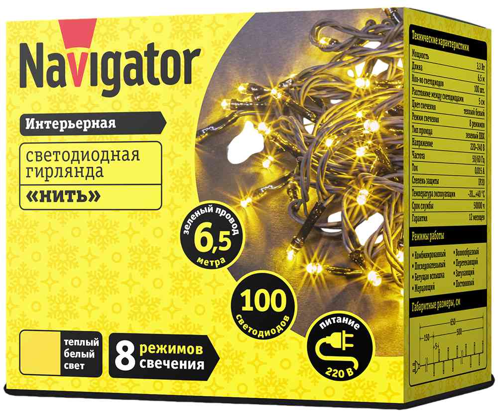 Гирлянда электрическая Navigator нить с тёплым светом-100 лампочек