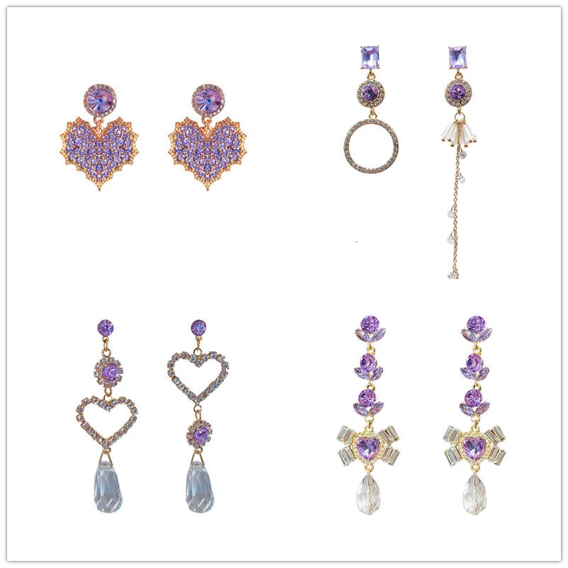 Korean Purple Rhinestone Love Heart Flower Dangle Earrings Long Water Drop Crystal Jewelry Pendientes For Women Fashion Brincos