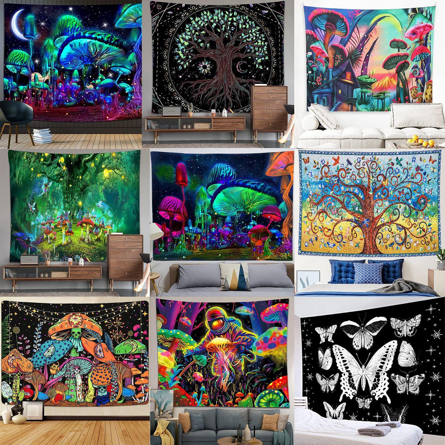 Гобелен с грибами для спальни, психоделическое растение, звездная ночь, настенный черный световой постер для украшения интерьера, гобелен