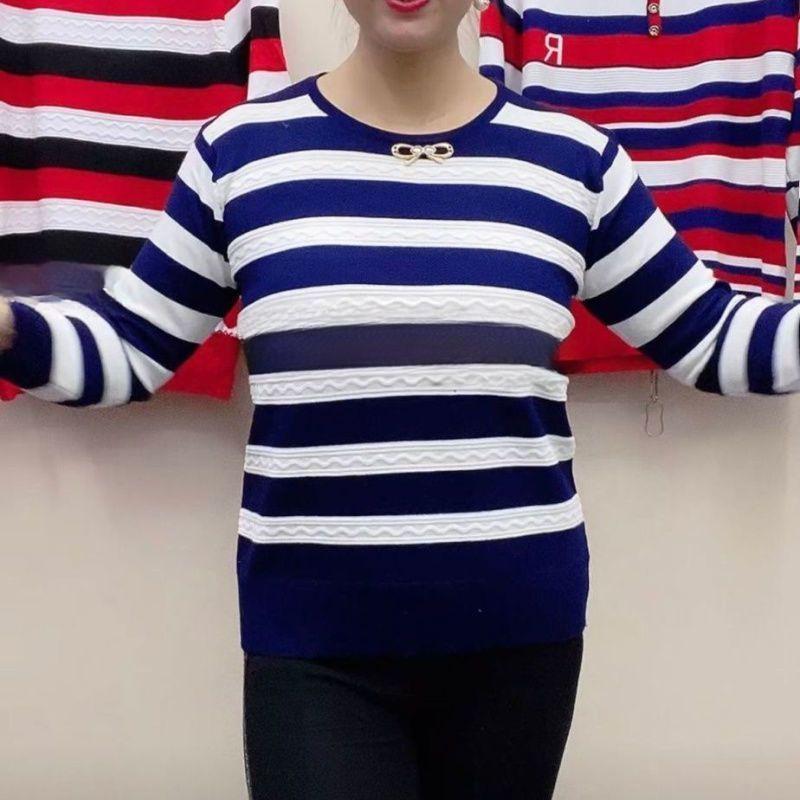 Горизонтальная полосатая трикотажная нижняя рубашка женская среднего возраста плюс размер тонкий эластичный свитер модная футболка XL темно-синий