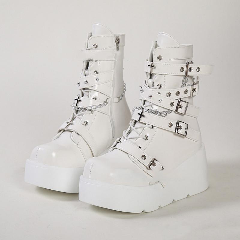 Готический стиль Платформа Вампир Косплей Женские Ботинки до середины икры Зимние Клинья Удобные Женские Мотоциклетные Ботинки Обувь 34EU/CN35