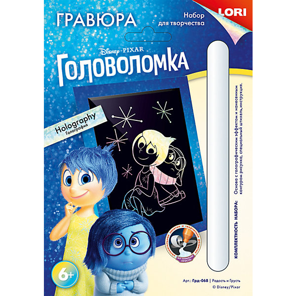 Гравюра "Радость и грусть" с эффектом голографик содержит в комплекте основу и специальный штихель. Контур изображения уже нанесен на черный фон. С помощью специального штихеля изображение процарапывается по контуру, и из-под слоя краски появляется радужная, переливающаяся основа. В результате получается рисунок с эффектным изображением эмоций девочки Райли – Радости и Грусти. Оборотная сторона упаковки послужит рамкой для готовой гравюры. Несложный и занимательный процесс создания гравюры принесет удовольствие ребенку, поможет развить творческие способности, фантазию и внимательность, а получившаяся картина будет достойным украшением интерьера или прекрасным подарком друзьям и близким.