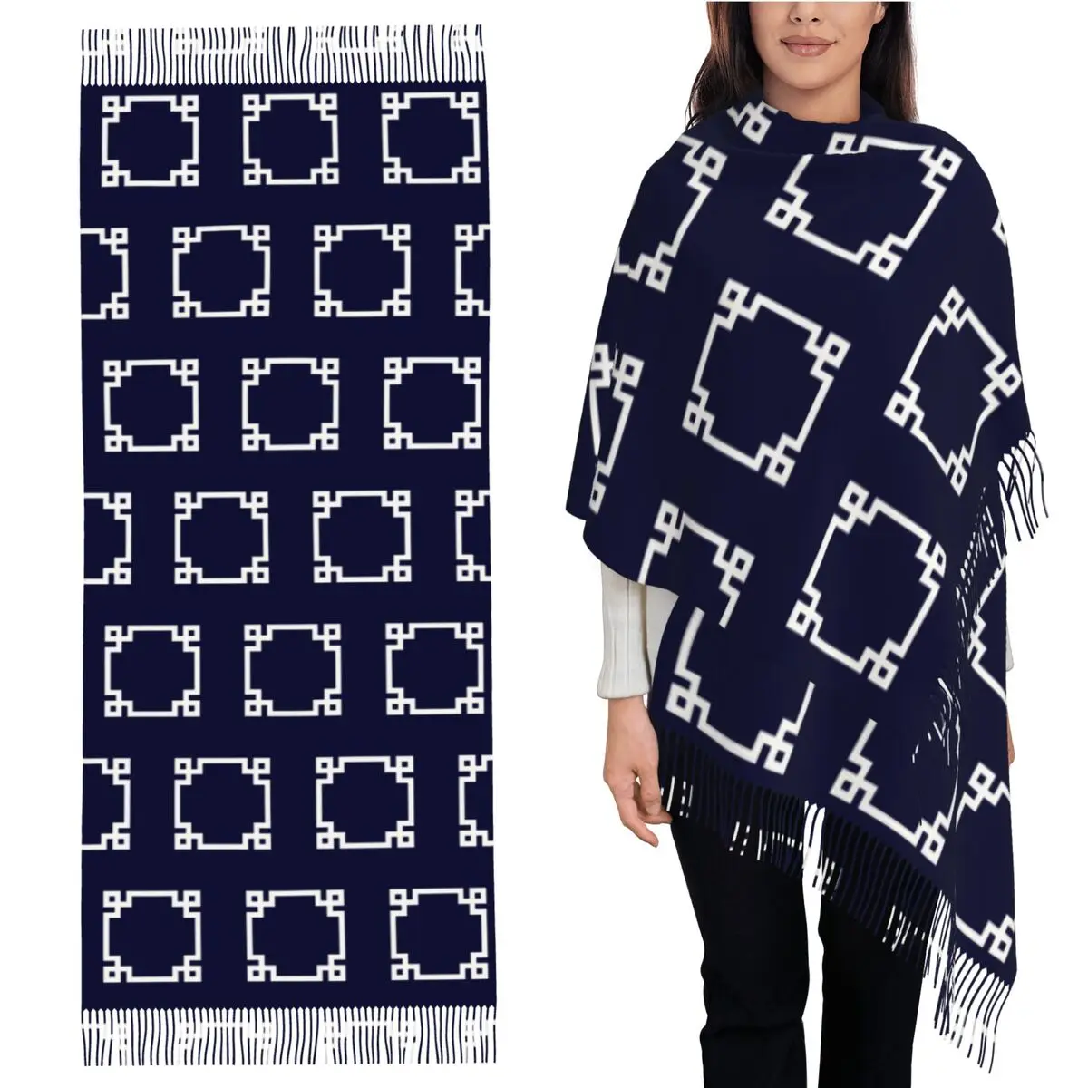 Греческий ключевой квадрат, белый на темно-синем шарфе, шарфы с кисточками, женские мягкие теплые шали и накидки, большая осенне-зимняя шаль