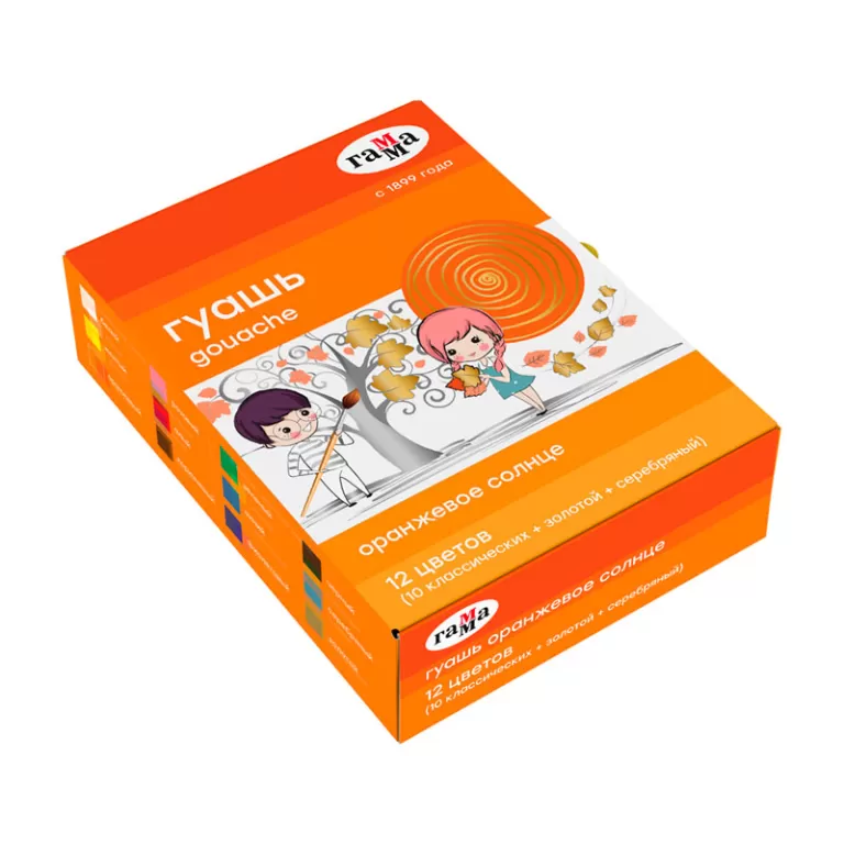 Гуашь Гамма Оранжевое солнце 12 цветов: 10 классических, золотой, серебряный 20 мл