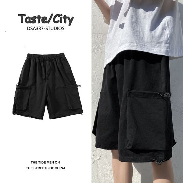 men's shorts summer overalls korean fashion loose big pocket casual harajuku streetwear retro five-point pants men vees, White;black