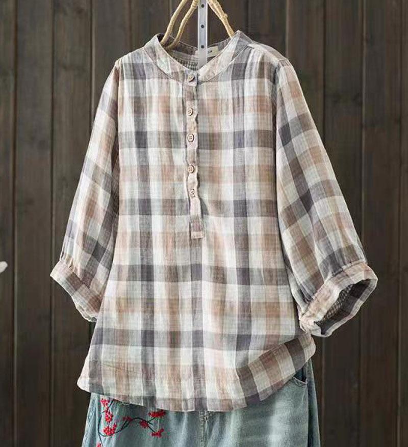 Двухслойная хлопковая пряжа с круглым вырезом, клетчатая рубашка, летняя женская свободная блузка больших размеров, топы из хлопковой пряжи в стиле ретро с коротким рукавом One Size