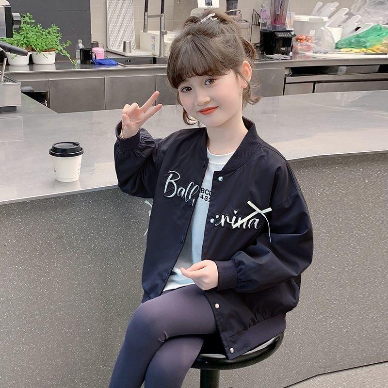 Девичьи бейсбольные куртки Осенняя вышивка букв Тонкая верхняя одежда Весенняя униформа Пальто с бантом-бабочкой Детская одежда 100 темно-синий