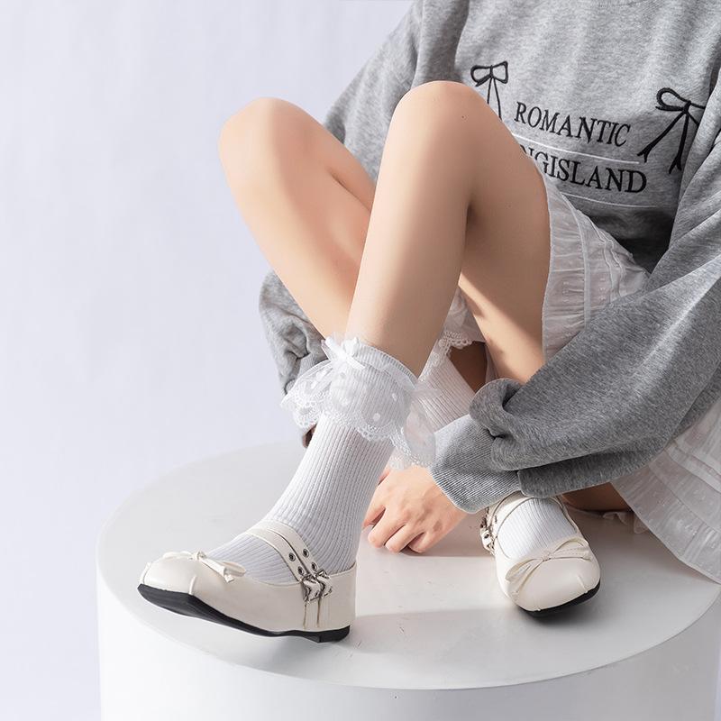 Девичьи весенне-осенние носки с кружевными бантами, девичьи гольфы до середины икры в стиле Лолиты, осенне-зимние студенческие носки в балетном стиле 1 pair белый