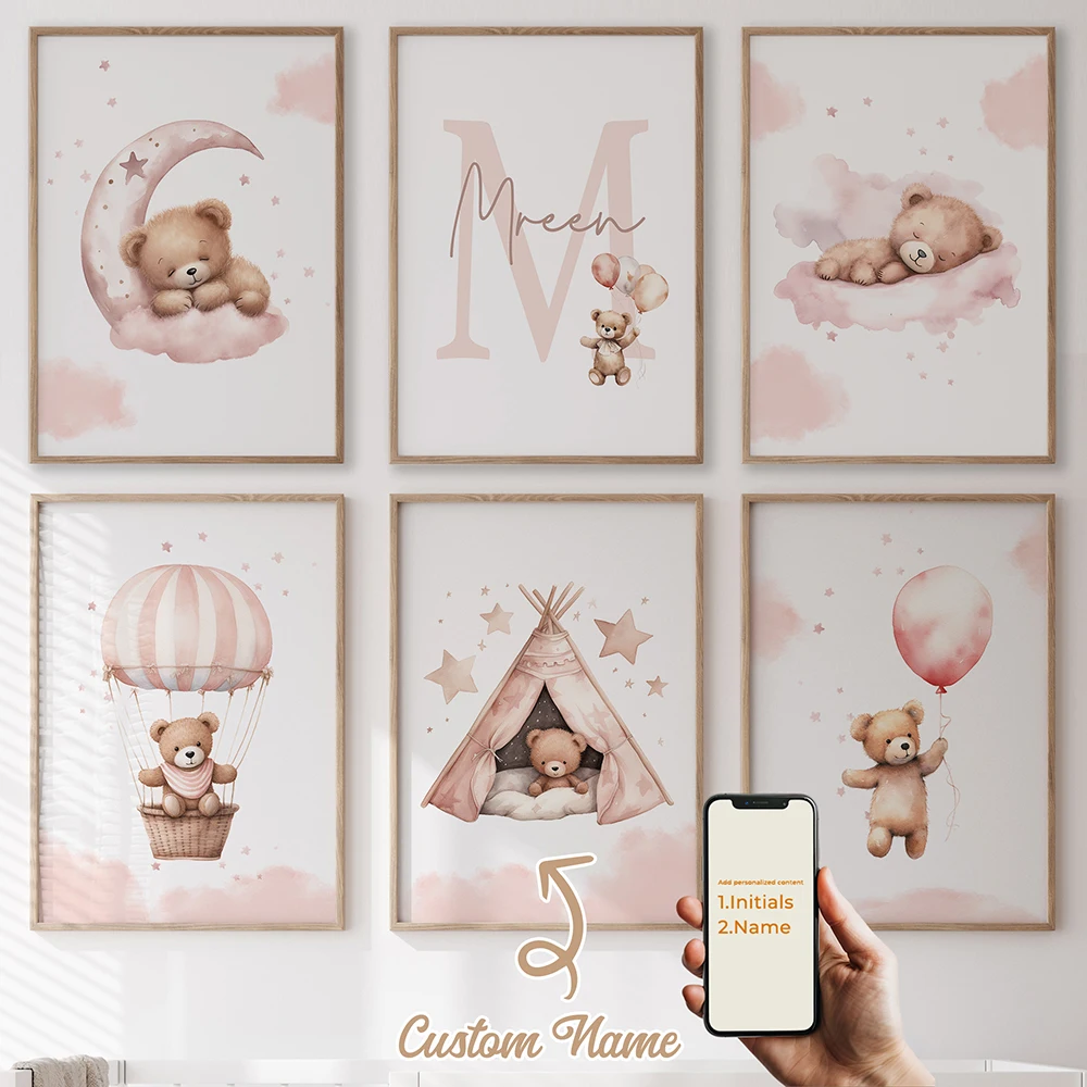 6pcs Customized Name, Pink Bear Background. Wall Art Prints Canvas Painting Poster Picture For Living Room Home Decor
