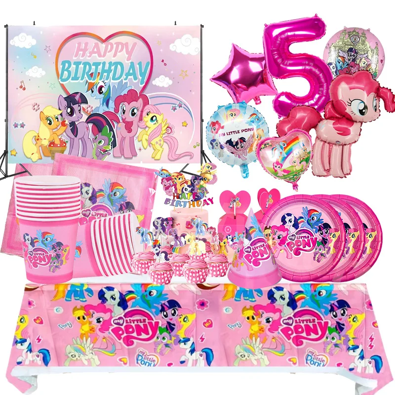 Декоративные тарелки для дня рождения с изображением мультяшного Маленького Пони, чашка, Розовая лошадь, латексная скатерть с воздушным шаром для будущей мамы, товары для вечеринки для девочек