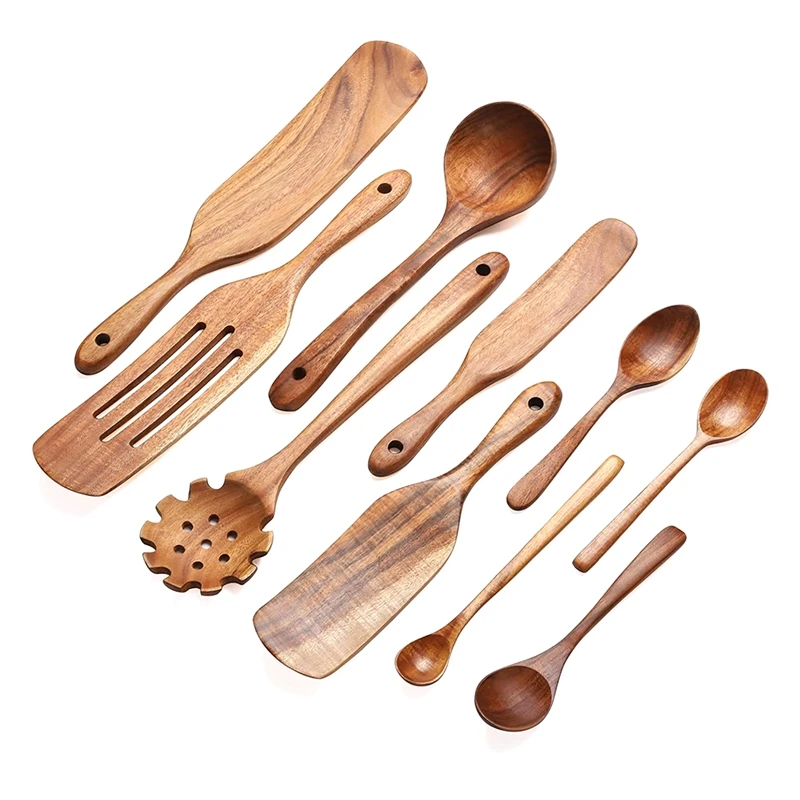 Деревянная кухонная утварь, набор из 10 шпателей, кухонные инструменты, деревянные ложки для приготовления пищи, перемешивания, смешивания, ...