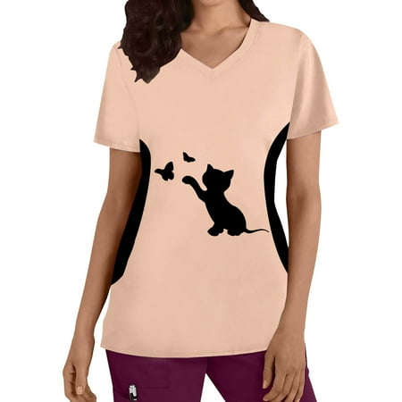 Women Scrubs Top Cats Printed Plus Size V Neck Short Sleeve T Shirt With Pocket Spring Summer Daily Nursing Uniforms Nursing Care Working Uniforms