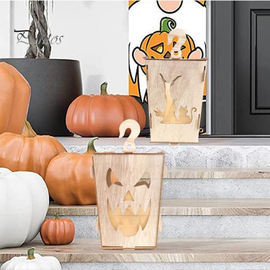 Деревянные фонарики на Хэллоуин, светодиодные фонари, работающие от батареек, подвесные лампы для украшения вечеринок, фонари ручной работы для помещений и улицы с игривым праздничным элементом A