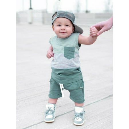 AMILIEe Baby Boy Color Block Tank Tops Sleeveless T-Shirt Solid Shorts Outfit 0-5 Years