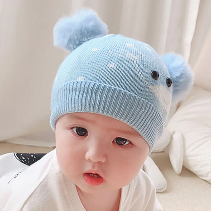 Детская вязаная шапка для мальчиков и девочек, осенне-зимняя теплая шапка с двойным шерстяным помпоном и мультяшным рисунком оленя