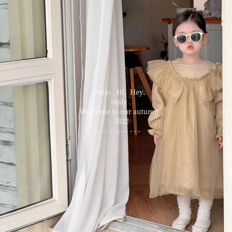 Детская одежда, весна-осень 2022, корейские милые детские кружевные однотонные платья принцессы для девочек на день рождения, одежда для мале...