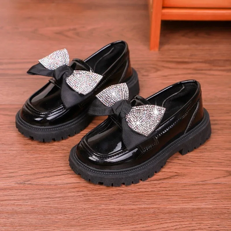 Детская повседневная обувь с блестящими бантами, универсальная детская кожаная обувь с круглым носком, нескользящая осень 2023, новинка 202, шикарная обувь на плоской подошве для девочек в корейском стиле
