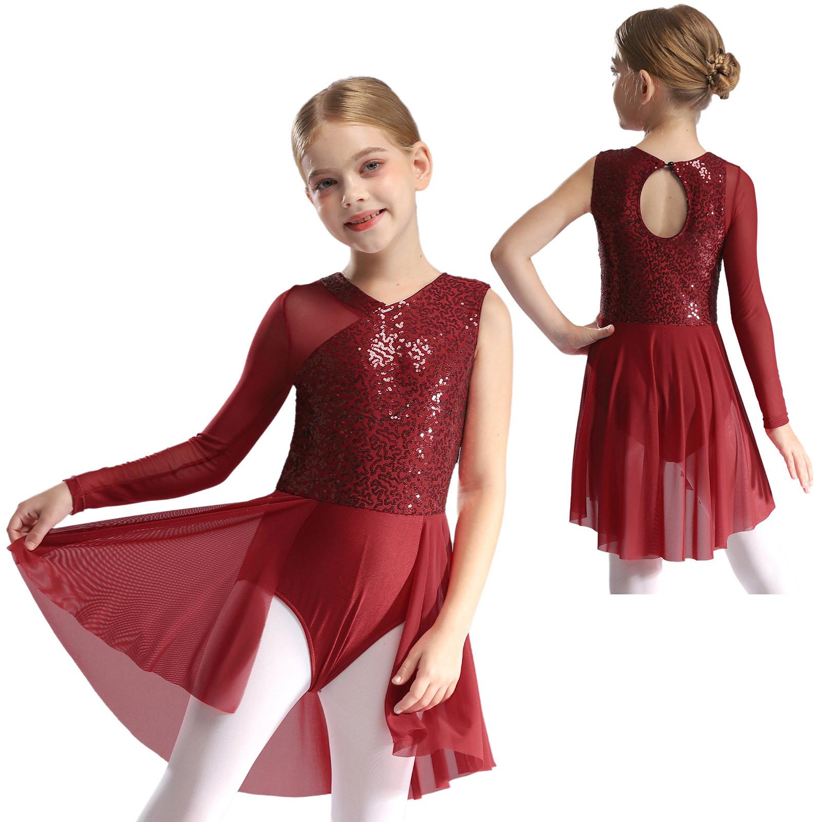 Детская танцевальная одежда для девочек LJazz, танцевальное платье для фигурного катания, асимметричный рукав на одно плечо, блестящие пайетки, балетный купальник с юбкой 5-6 Years бордовый