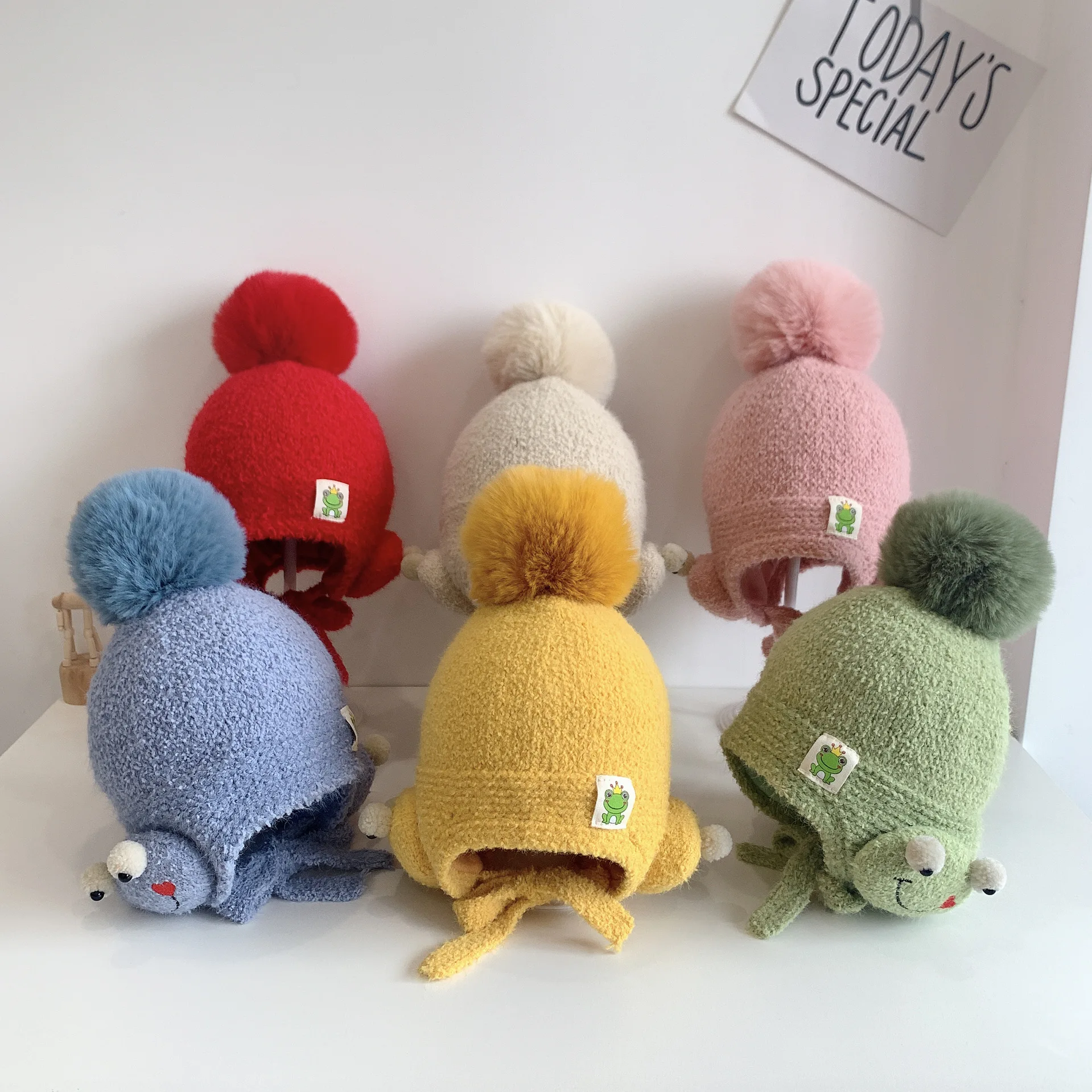 Детская шапка на осень и зиму, Детская плюшевая шапка с ремешками для защиты ушей, теплая шерстяная шапка с мультяшным принтом лягушки для м...