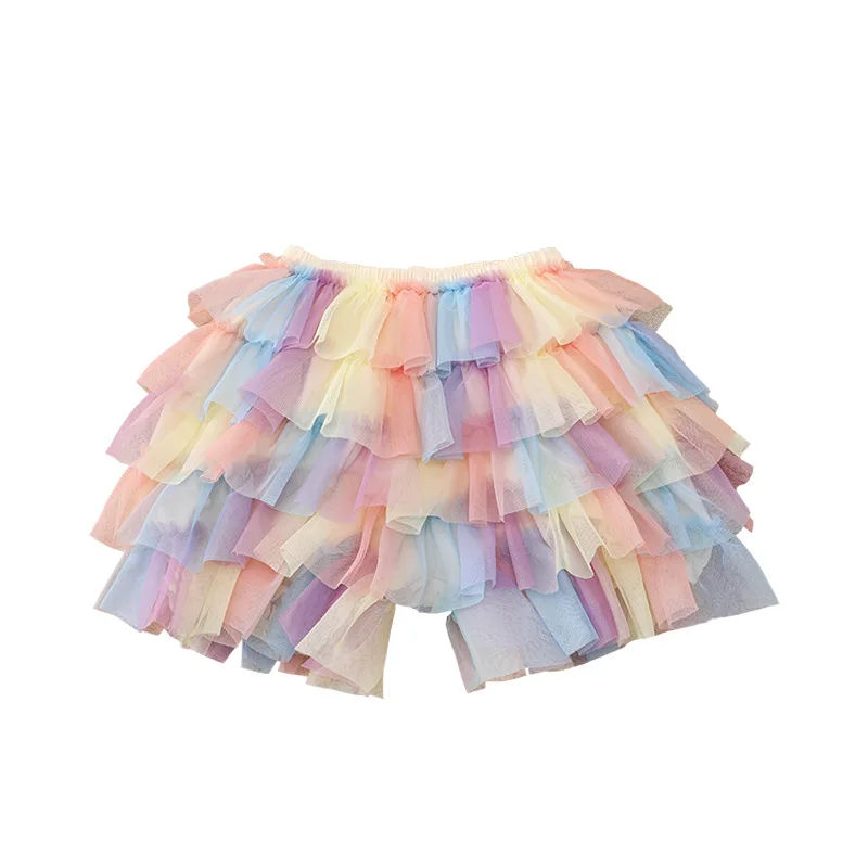 Детские брюки, юбка, короткая крутая новая летняя красочная сетчатая пышная юбка для девочек, шорты принцессы, мягкие брюки с цветочным бутоном