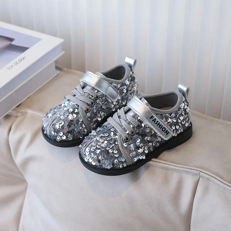 Детские кожаные туфли со сверкающими пайетками, повседневная обувь для девочек, круглый носок, стиль принцессы, 2024, новая детская спортивная обувь на липучке 33 серебряный