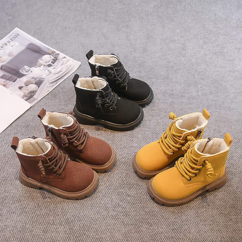 Детские модные ботильоны, новая зимняя плюшевая бархатная теплая обувь для девочек желтого и коричневого цвета на плоской подошве, размер 26-36
