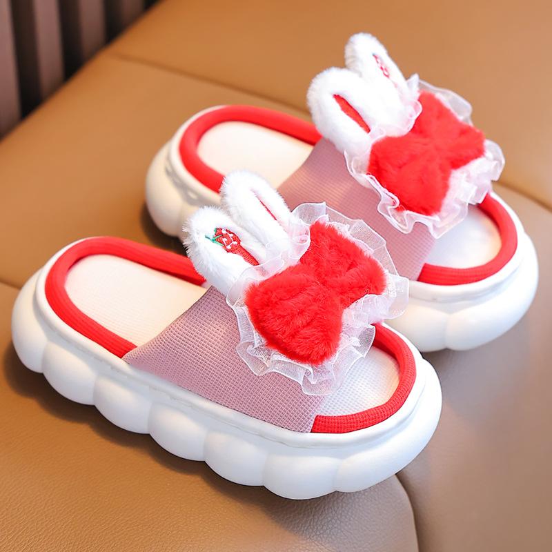 Детские тапочки для девочек, тапочки с бантом, милые домашние тапочки с ушками кролика из мультфильма, нескользящие мягкие льняные шлепанцы для детей на открытом воздухе 24-25 красный