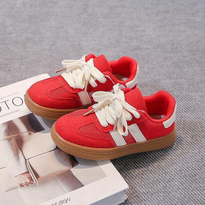 Детские теннисные туфли конфетного цвета сетчатые дышащие туфли на плоской подошве для девочек нескользящие 2025 новая детская спортивная обувь полосатая мягкая подошва комфорт 26 красный