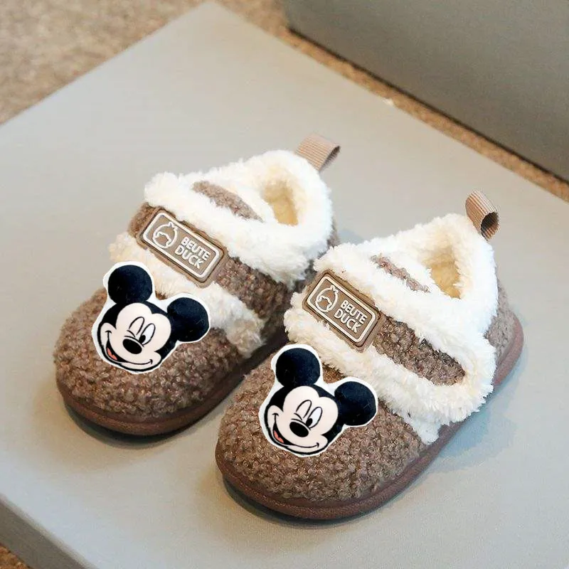 Детские хлопковые тапочки Disney, зимняя домашняя хлопковая домашняя обувь для девочек, нескользящая повседневная обувь с Микки Маусом, обувь для мальчиков и малышей