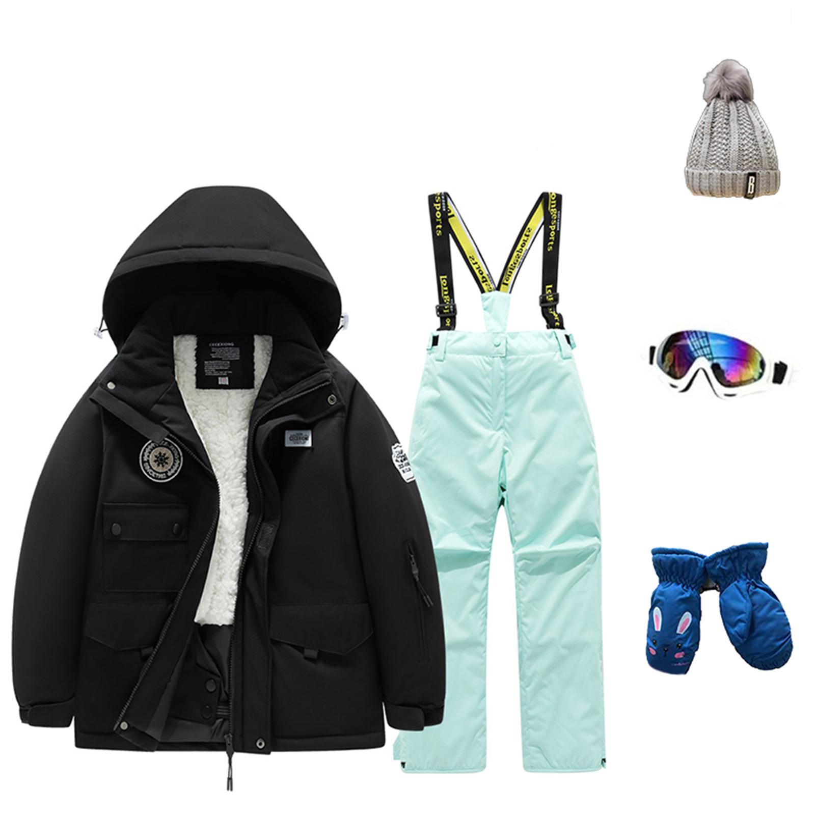 Детский модный лыжный комплект для мальчиков и девочек, утепленный, водонепроницаемый, термобелье, костюм из пяти предметов с курткой и брюками 14