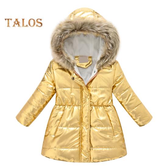 Детское длинное пальто, зимняя теплая парка, верхняя одежда, куртка с металлическим блеском и меховой отделкой на капюшоне, утепленное лыжное пальто для мальчиков и девочек 110cm жёлтый