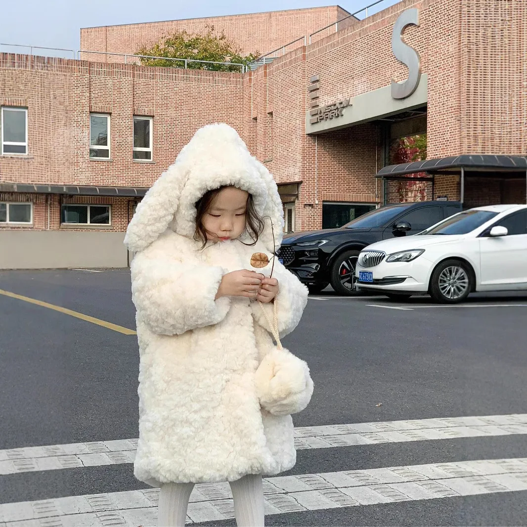 Детское пальто 2024, зимнее пальто для девочек с милыми мультяшными ушками, белое мягкое восковое пальто с капюшоном из овечьей шерсти, среднее и длинное теплое пальто