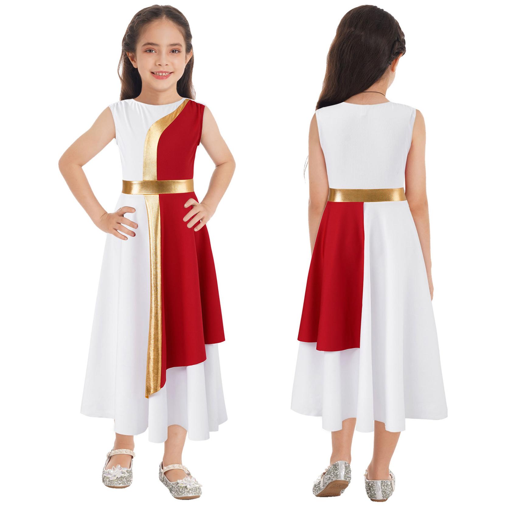 Детское платье для танцев для девочек, длинное платье без рукавов, контрастная лоскутная танцевальная одежда с крестом и хвалой 9-10 Years красный
