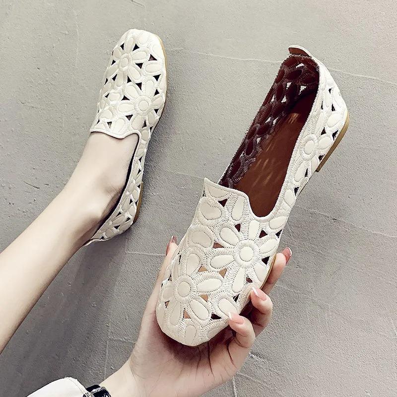 Дешевые летние вырезанные белые кожаные туфли женские дышащие балетки женские шикарные цветочные мокасины легкая обувь большой размер 42 CN 37 (235)
