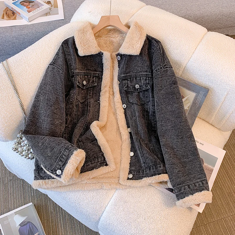 Джинсовая куртка из овечьей шерсти и хлопка Корейская Женская осенне-зимняя утепленная плюшевая куртка с отворотом Новинка 2023 Повседневная универсальная теплая верхняя одежда