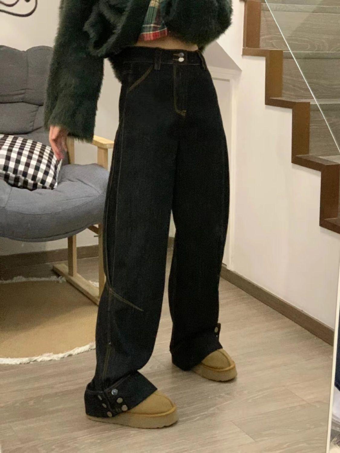 Джинсы больших размеров с высокой талией в стиле ретро прямого кроя – Дизайн с отворотами, Длина до пола для весны и осени XL чёрный