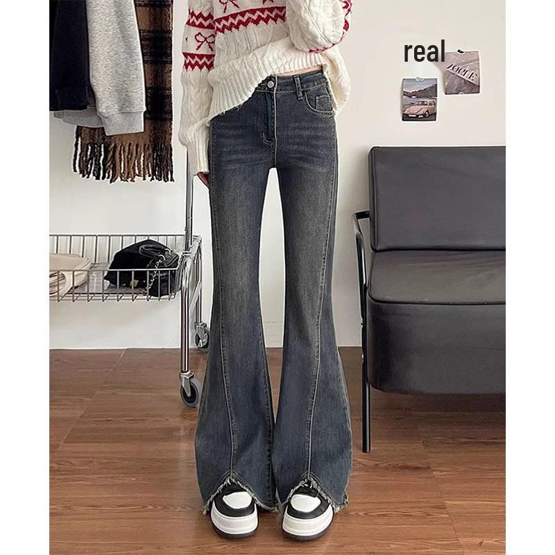 Джинсы клеш больших размеров с высокой посадкой и эластичным разрезом – Стройнящие широкие брюки-подковы для женщин (Весна осень) 3XL синий