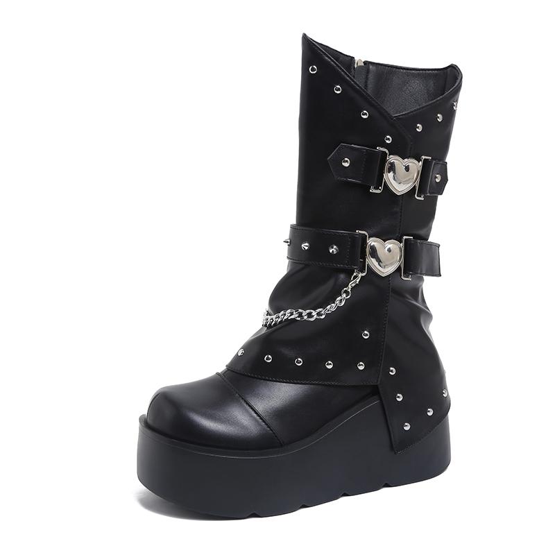 Дизайнерская Мода Заклепки Женские Брюки Штанины Высокие Клинья Сапоги Мода Панк Стиль Обувь Осень Зима Толстый Каблук Женские Рыцарские Длинные Ботильоны 35 чёрный