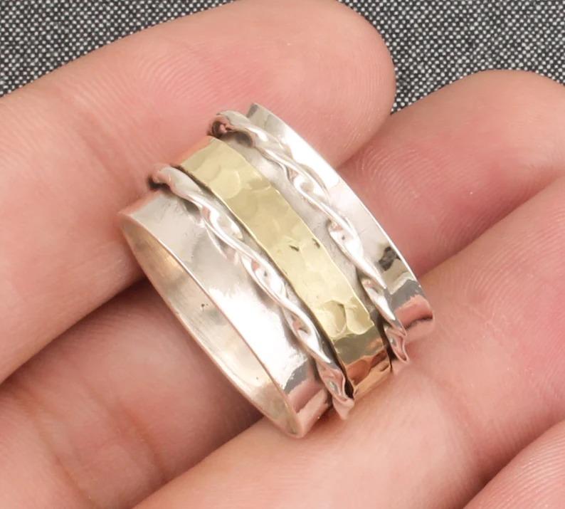 Дизайнерское кольцо ручной работы, серебро 925 пробы, подарок на годовщину дня рождения, кольцо в стиле бохо, двухцветное кольцо, кольцо-спиннер, серебряное кольцо 6