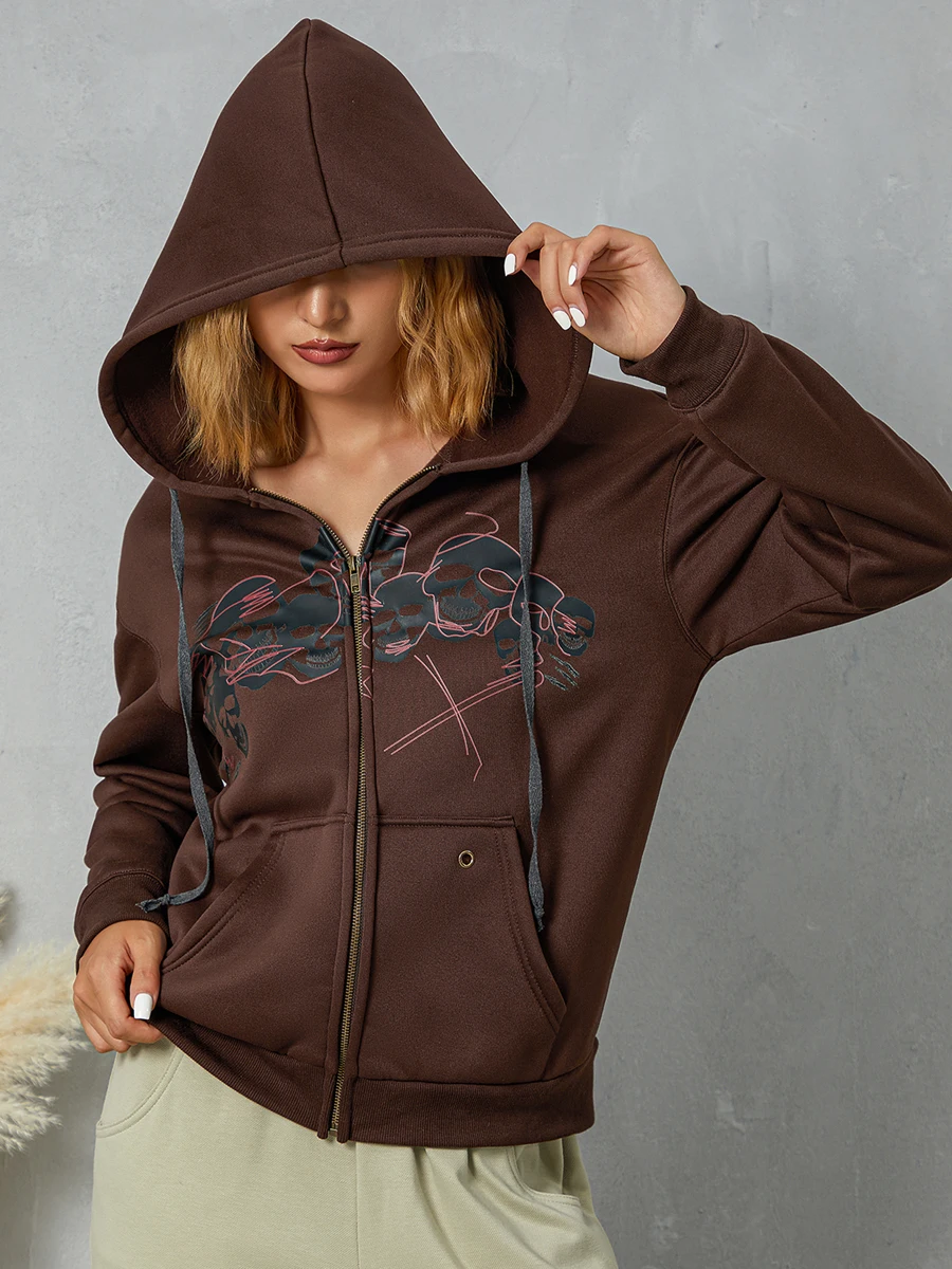 Женская толстовка с капюшоном, куртка в стиле хип-хоп с длинным рукавом и принтом черепа/крыла на молнии, одежда Y2K, весна-осень