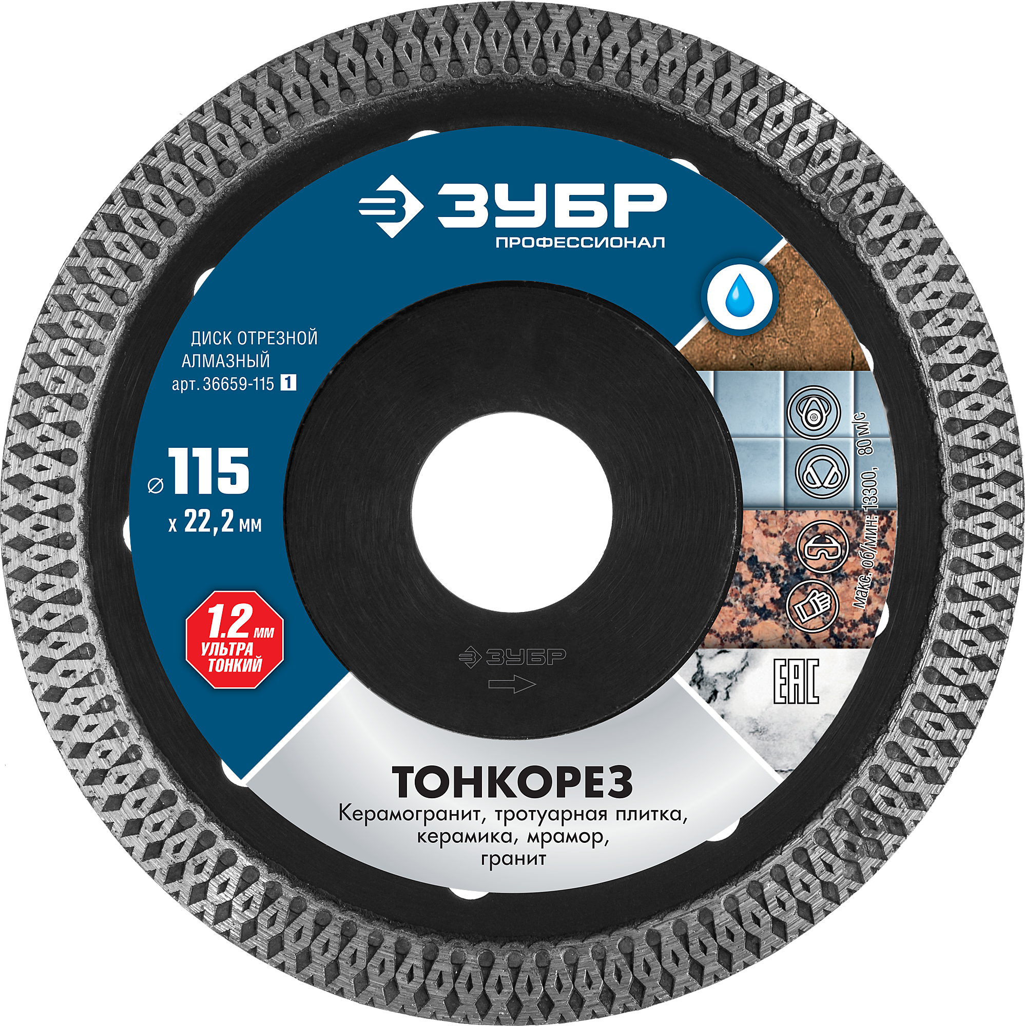 Диск отрезной алмазный Зубр ПРОФЕССИОНАЛ ⌀11.5 см x 1.2 мм x 2.22 см, прямой, по керамограниту, мрамору, плитке, 1 шт. (36659-115_z01)
