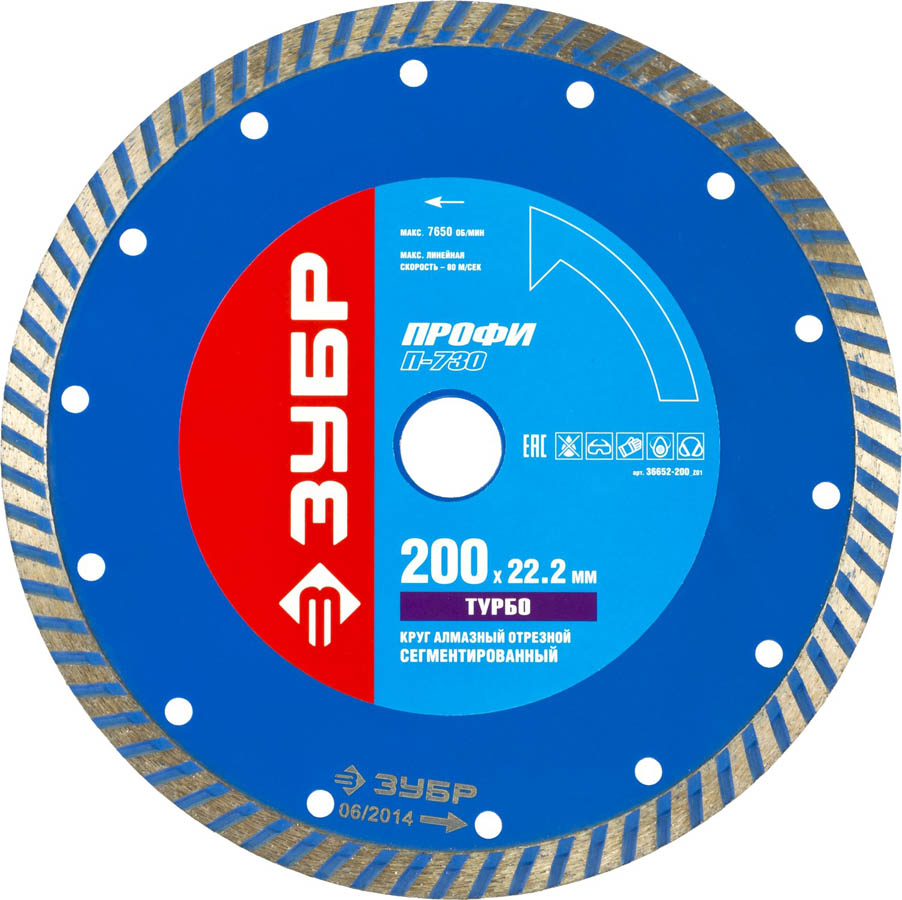 Диск отрезной алмазный Зубр ПРОФЕССИОНАЛ ⌀20 см x 2.22 см, прямой, по бетону, кирпичу, граниту, 1 шт. (36652-200)