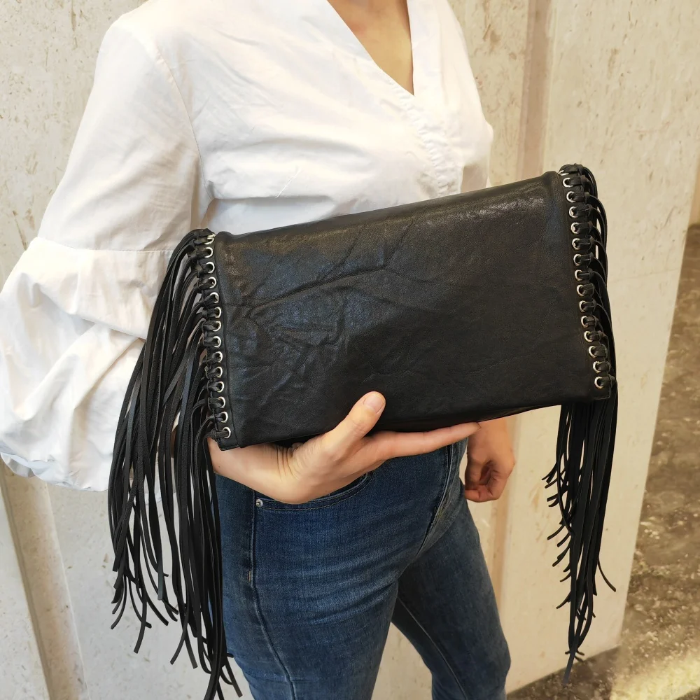 Длинная кисточка с заклепками в стиле панк, плиссированная женская сумка подмышками, черная искусственная кожа, женские сумки на плечо Y2K, уличные женские клатчи с бахромой, сумка