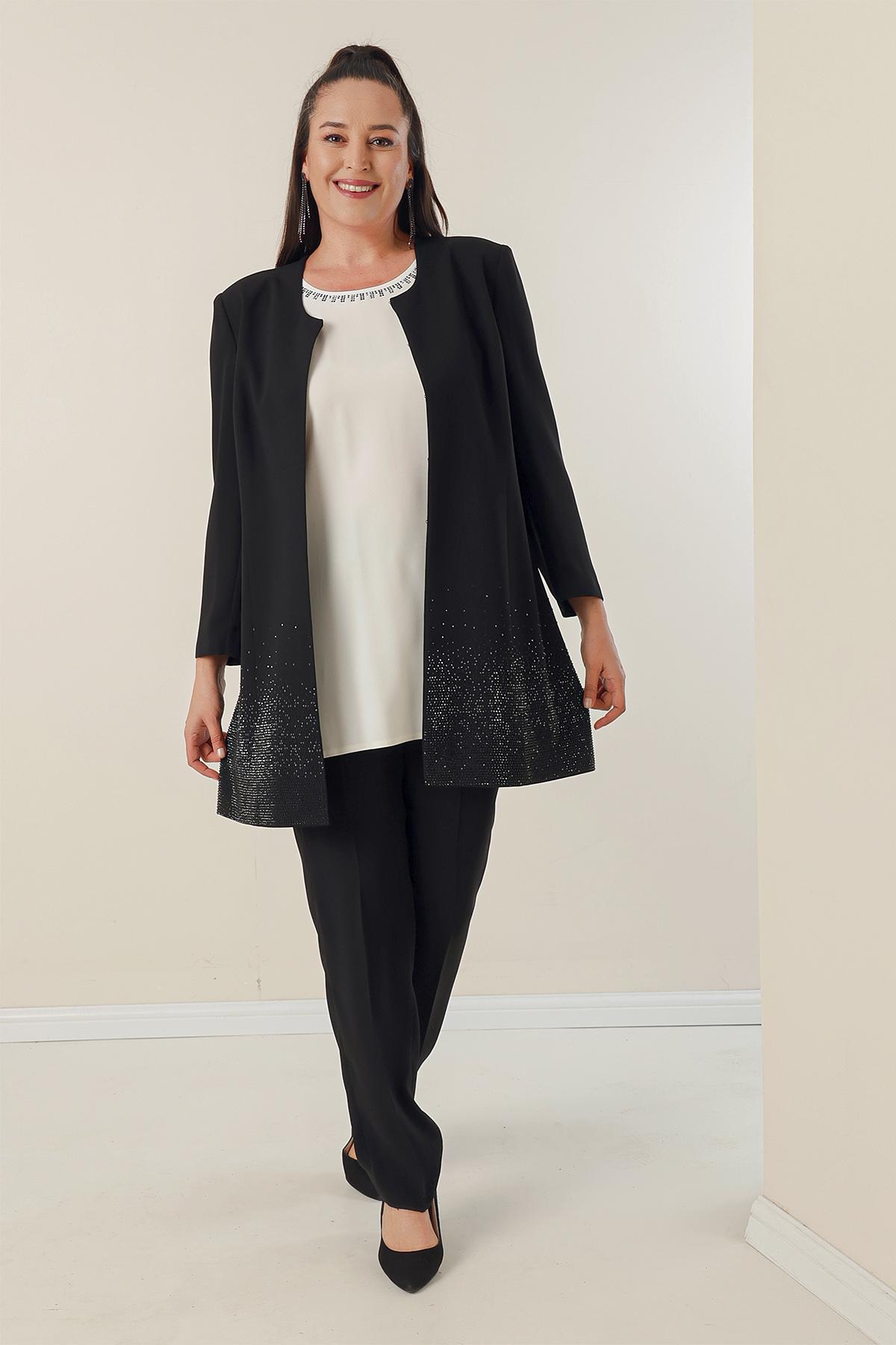 Длинная куртка-блузка с каменной подкладкой и брюками, комплект из 3 предметов большого размера XL чёрный