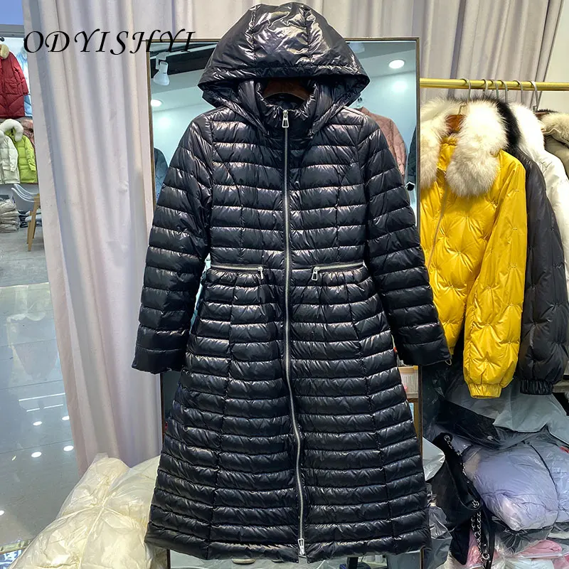 Длинная парка, Женская куртка на 90% белом утином пуху, 2021 Толстая зимняя черная дутая куртка с капюшоном, женское повседневное теплое пальто ...