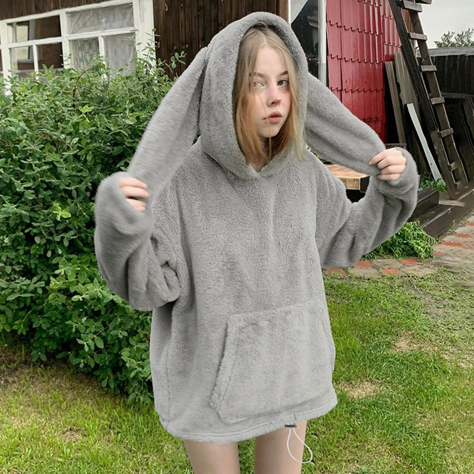 Длинная толстовка с графическим рисунком, Женская Теплая Флисовая Свободная куртка с капюшоном с кроличьими ушками, флисовая куртка с большими карманами, пуловер в стиле Харадзюку, милые плюшевые пальто