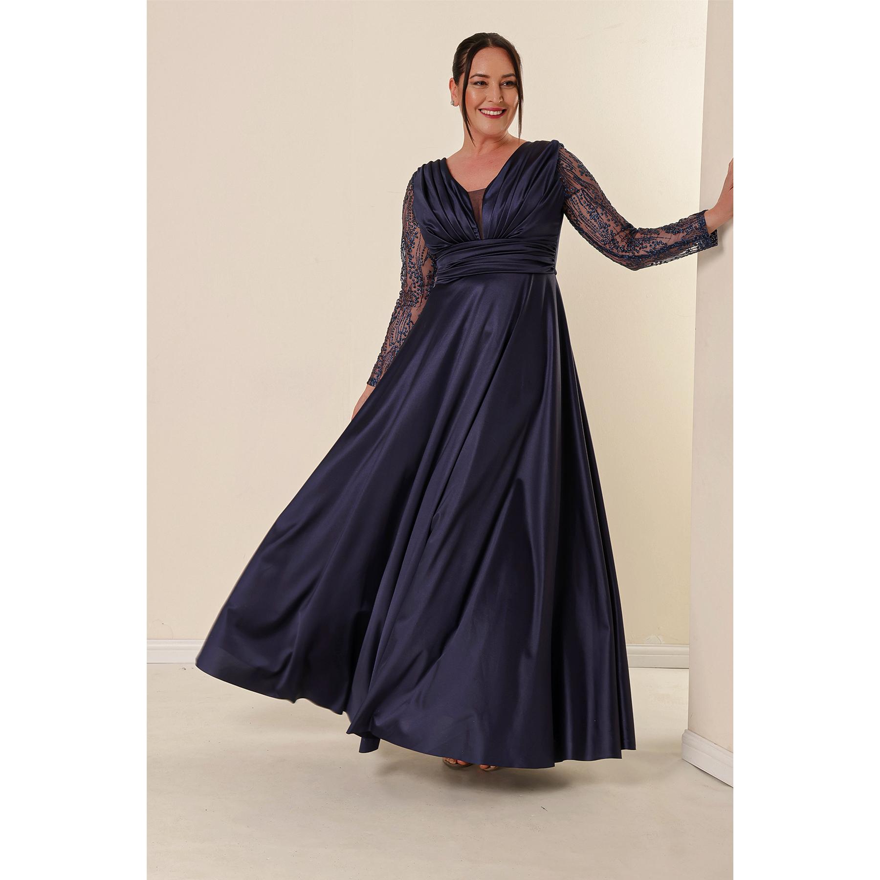 Длинное атласное вечернее платье больших размеров с блестящими фатиновыми рукавами с отделкой спереди и складками