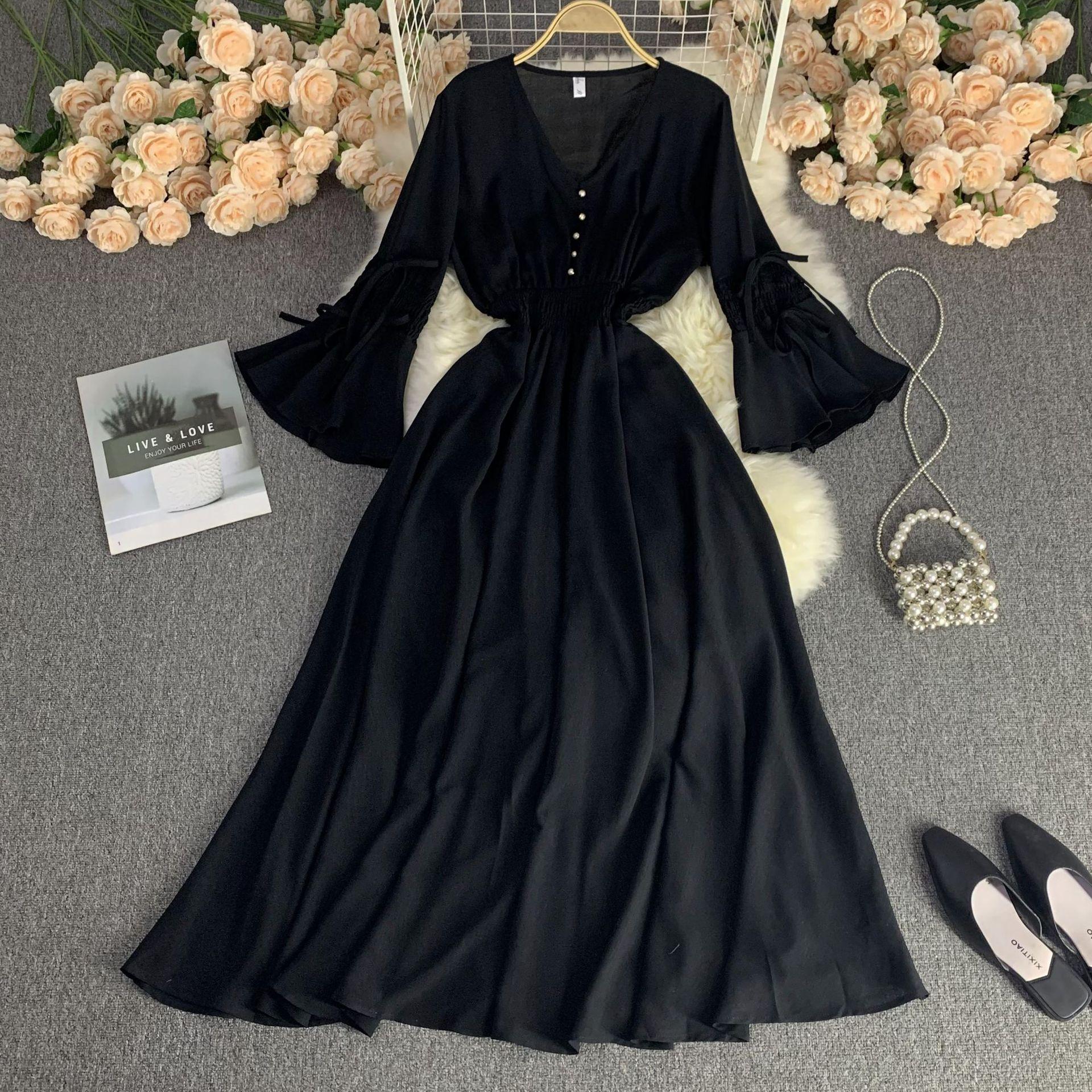 Длинное платье весна-осень для женщин, элегантное, с V-образным вырезом, расклешенными рукавами и высокой талией, праздничное, пляжное, макси-платье One Size
