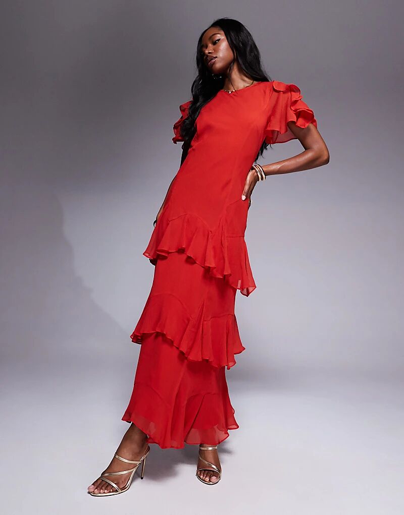 Длинное платье из шифона с оборками ASOS DESIGN темно-красного цвета